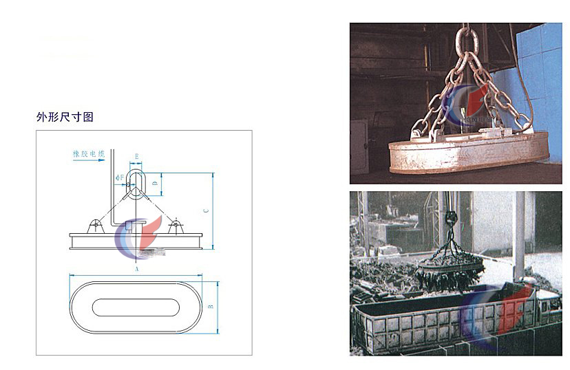 | 特點: 1、電磁鐵是一種適應車箱形狀的橢圓形,所以能高效地裝卸廢鋼鐵。 2、磁場深、磁勢大,一次可大量起吊廢鋼鐵。